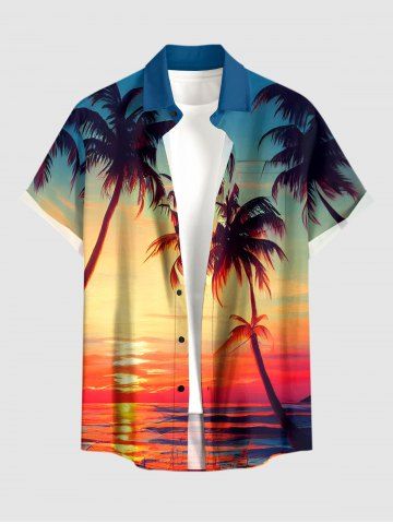 Short Sleeves Shirts > Plus Size Coconut Tree Sea Ombre Dusk Sunset Print Hawaii Button Pocket Shirt For Men