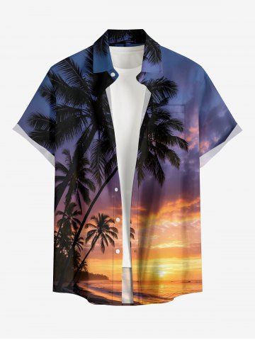 Plus Size Coconut Tree Sea Ombre Sky Print Hawaii Button Pocket Shirt For Men - Deep Blue - M