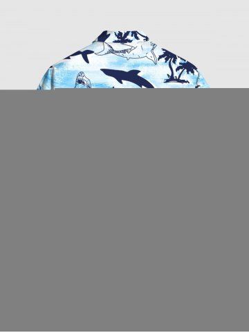 Plus Size Coconut Tree Sea Shark Print Hawaii Sea Creatures Buttons Pocket Shirt For Men - Sky Blue - S