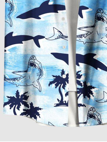 Plus Size Coconut Tree Sea Shark Print Hawaii Sea Creatures Buttons Pocket Shirt For Men - Sky Blue - L