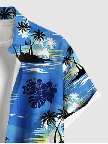 Plus Size Coconut Tree Sea Tropical Leaf Hibiscus Flower Print Hawaii Button Pocket Shirt For Men - Sky Blue - S