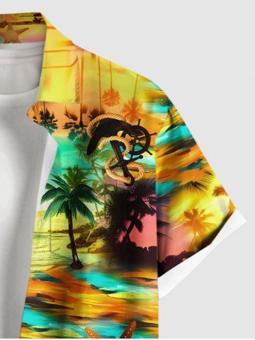 Plus Size Coconut Tree Sea Waves Beach Starfish Anchor Print Hawaii Cruise Button Pocket Shirt For Men - Yellow - 6xl