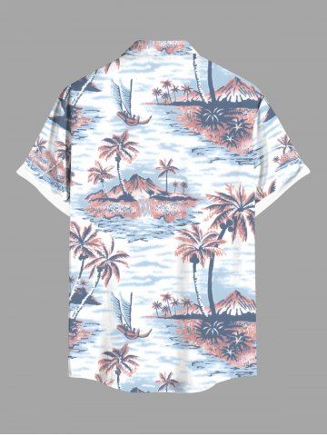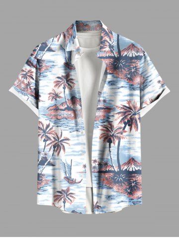 Plus Size Coconut Tree Sea Waves Boat Print Buttons Pocket Hawaii Shirt For Men - Sky Blue - S