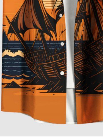 Plus Size Coconut Tree Sea Waves Boat Sun Print Buttons Pocket Hawaii Shirt For Men - Orange - S