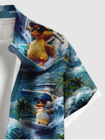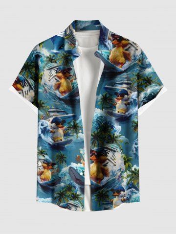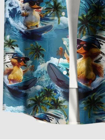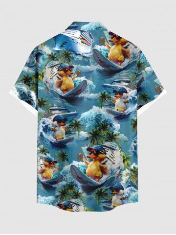 Plus Size Coconut Tree Sea Waves Surfing Ducks Ship Print Buttons Pocket Hawaii Shirt For Men - Sky Blue - 6xl
