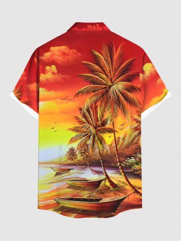 Short Sleeves Shirts > Plus Size Coconut Tree Seascape Boat Bird Cloud Ombre Sky Print Buttons Pocket Hawaii Shirt For Men