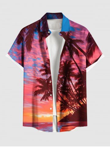 Plus Size Coconut Tree Seascape Colorful Sky Cloud Print Buttons Pocket Hawaii Shirt For Men - Light Pink - M