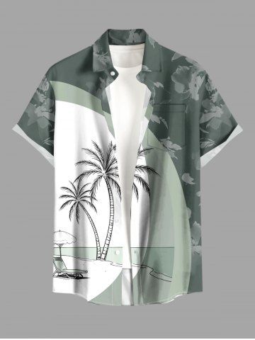 Plus Size Coconut Tree Seascape Umbrella Flowers Colorblock Print Buttons Pocket Hawaii Shirt For Men - Light Green - S