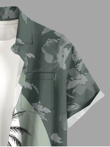Plus Size Coconut Tree Seascape Umbrella Flowers Colorblock Print Buttons Pocket Hawaii Shirt For Men - Light Green - 3xl