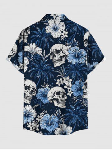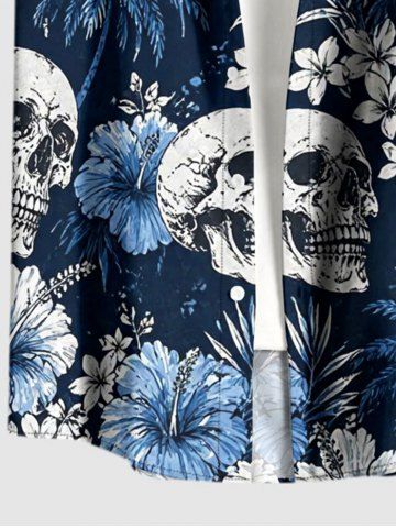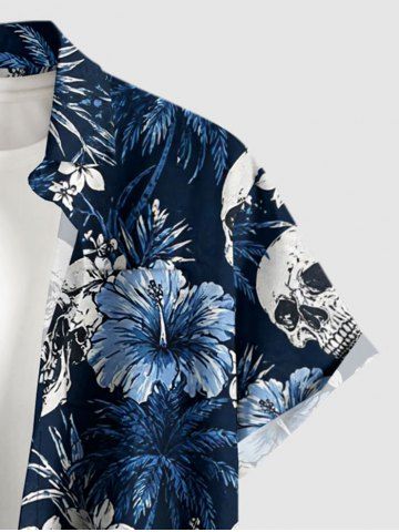 Plus Size Coconut Tree Skull Hibiscus Flower Print Buttons Pocket Hawaii Shirt For Men - Deep Blue - L