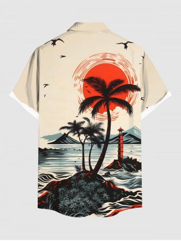 Short Sleeves Shirts > Plus Size Coconut Tree Sun Bird Seascape Print Buttons Pocket Hawaii Shirt For Men