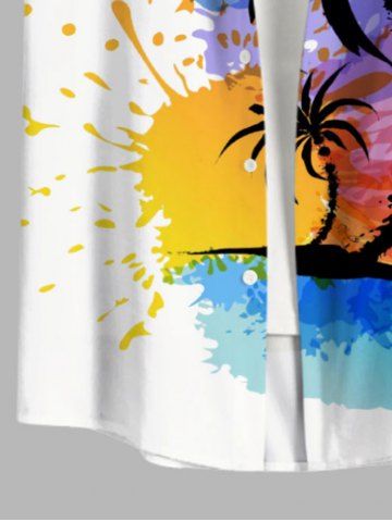 Plus Size Coconut Tree Sun Colorful Watercolor Painting Splatter Tie Dye Print Hawaii Button Pocket Shirt For Men - White - 4xl
