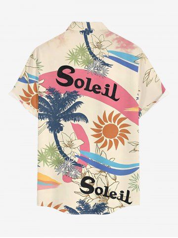 Plus Size Coconut Tree Sun Flower Letter Print Hawaii Button Pocket Shirt For Men - Light Coffee - L