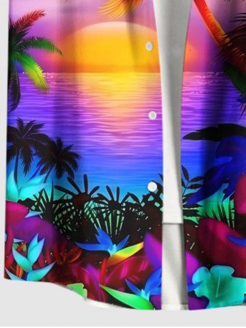 Plus Size Coconut Tree Sun Flowers Seascape Print Buttons Pocket Hawaii Shirt For Men - Purple - M