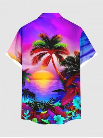Plus Size Coconut Tree Sun Flowers Seascape Print Buttons Pocket Hawaii Shirt For Men - Purple - 5xl