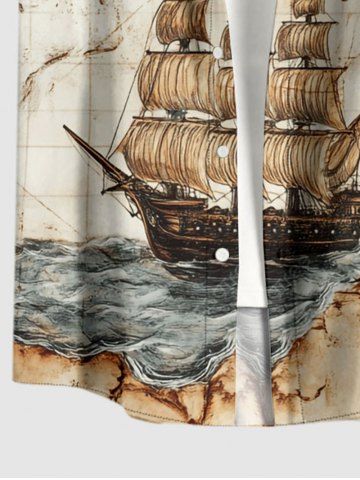 Plus Size Coconut Tree Sun Map Ship Cruise Print Buttons Pocket Hawaii Shirt For Men - Tan - 2xl
