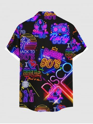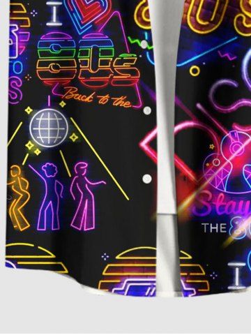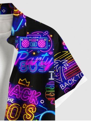Plus Size Coconut Tree Sun Recorder Letters Neon Print Buttons Pocket Hawaii Shirt For Men - Black - Xl