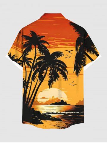 Plus Size Coconut Tree Sun Seascape Bird Print Buttons Pocket Hawaii Shirt For Men - Orange - S