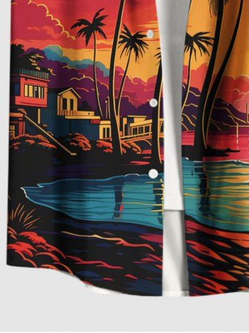 Short Sleeves Shirts > Plus Size Coconut Tree Sun Seascape Colorful Cloud Print Buttons Pocket Hawaii Shirt For Men