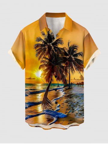 Plus Size Coconut Tree Sun Seascape Print Buttons Pocket Hawaii Shirt For Men - Golden Brown - L