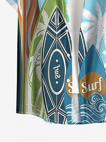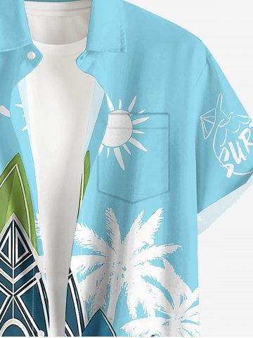 Plus Size Coconut Tree Sun Surfboard Sea Waves Print Hawaii Button Pocket Shirt For Men - Light Blue - L