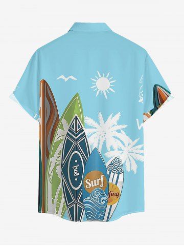 Plus Size Coconut Tree Sun Surfboard Sea Waves Print Hawaii Button Pocket Shirt For Men - Light Blue - 2xl