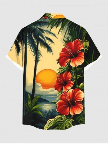 Short Sleeves Shirts > Plus Size Coconut Tree Sun Tropical Leaf Hibiscus Flower Print Hawaii Button Pocket Shirt For Men