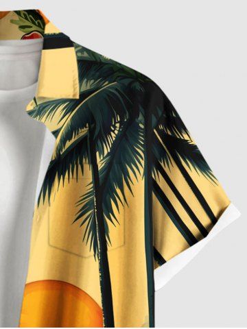 Plus Size Coconut Tree Sun Tropical Leaf Hibiscus Flower Print Hawaii Button Pocket Shirt For Men - Yellow - 5xl