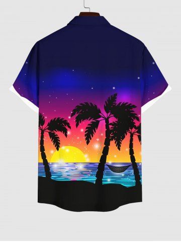 Plus Size Coconut Tree Sunset Ombre Colorblock Print Buttons Pocket Hawaii Shirt For Men - Black - L