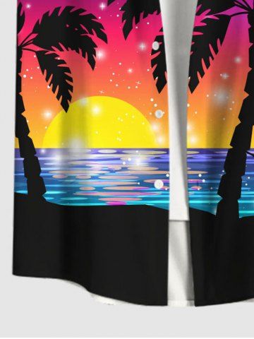 Plus Size Coconut Tree Sunset Ombre Colorblock Print Buttons Pocket Hawaii Shirt For Men - Black - Xl