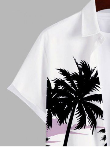 Plus Size Coconut Tree Sunset Sailboat Colorblock Print Buttons Pocket Hawaii Shirt For Men - White - Xl