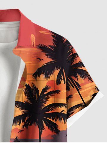 Plus Size Coconut Tree Sunset Sea Waves Print Buttons Pocket Hawaii Shirt For Men - Orange - M
