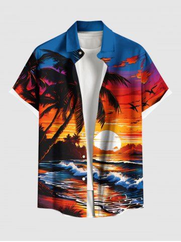 Short Sleeves Shirts > Plus Size Coconut Tree Sunset Sea Waves Print Hawaii Button Pocket Shirt For Men