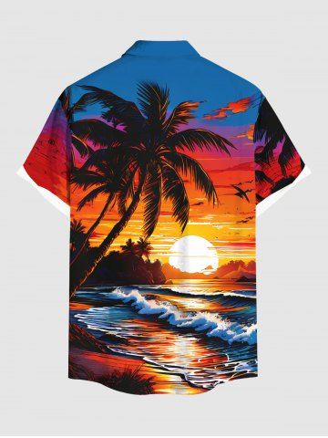 Short Sleeves Shirts > Plus Size Coconut Tree Sunset Sea Waves Print Hawaii Button Pocket Shirt For Men