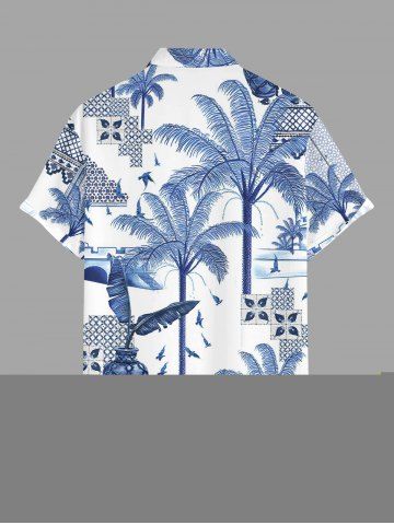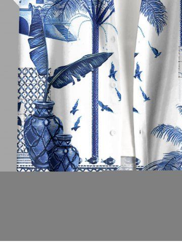 Plus Size Coconut Tree Tropical Leaf Blue and White Porcelain Style Print Hawaii Button Pocket Shirt For Men - Blue - L