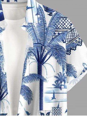 Plus Size Coconut Tree Tropical Leaf Blue and White Porcelain Style Print Hawaii Button Pocket Shirt For Men - Blue - Xl