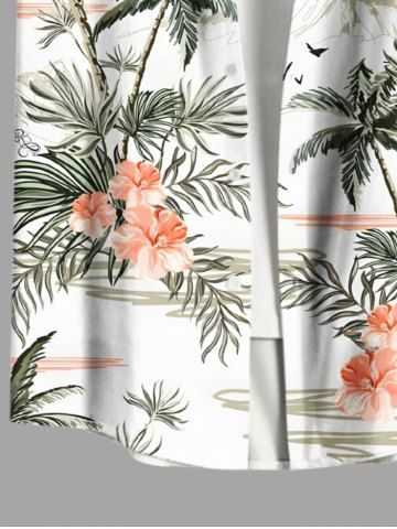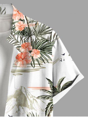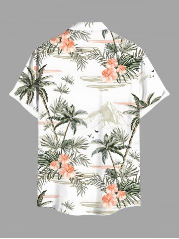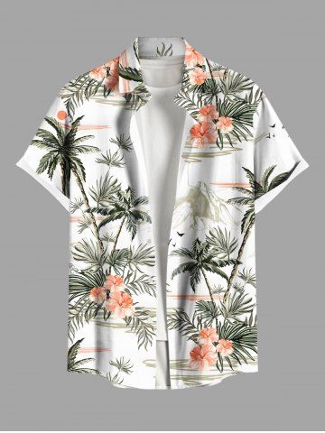 Plus Size Coconut Tree Tropical Leaf Hibiscus Flower Print Buttons Pocket Hawaii Shirt For Men - White - M
