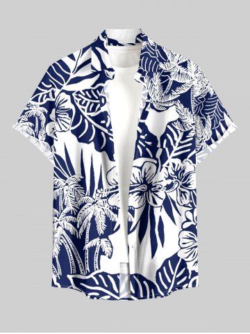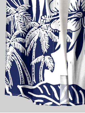 Plus Size Coconut Tree Tropical Leaf Hibiscus Flower Print Hawaii Button Pocket Shirt For Men - Navy Blue - M