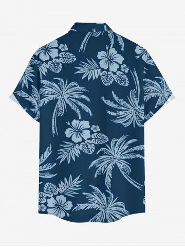 Plus Size Coconut Tree Tropical Leaf Hibiscus Flower Print Hawaii Button Pocket Shirt For Men - Deep Blue - 2xl