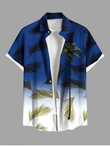 Plus Size Coconut Tree Tropical Leaf Ombre Colorblock Print Buttons Pocket Hawaii Shirt For Men - Blue - M