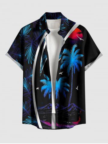 Plus Size Coconut Tree Tropical Leaf Sun Sea Waves Print Buttons Pocket Hawaii Shirt For Men - Black - Xl