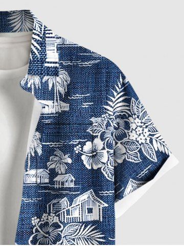Short Sleeves Shirts > Plus Size Coconut Tree Tropical Leaves Floral Seascape Lmitation Denim Print Hawaii Button Pocket Shirt For Men