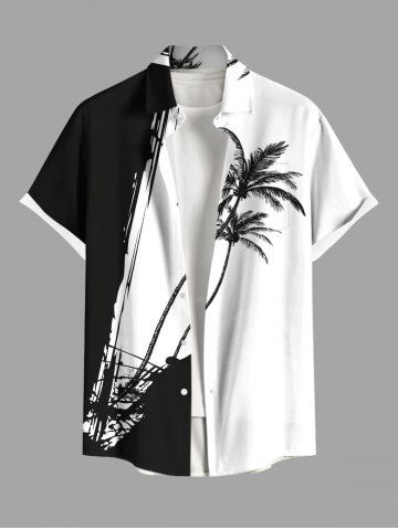 Plus Size Colorblock Coconut Tree Cliff Print Buttons Pocket Hawaii Shirt For Men - White - L