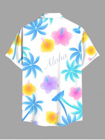 Plus Size Colorful Coconut Tree Hibiscus Flowers Print Buttons Pocket Hawaii Shirt For Men - White - S