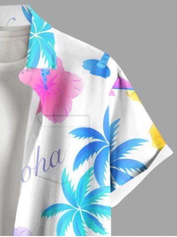Plus Size Colorful Coconut Tree Hibiscus Flowers Print Buttons Pocket Hawaii Shirt For Men - White - 2xl
