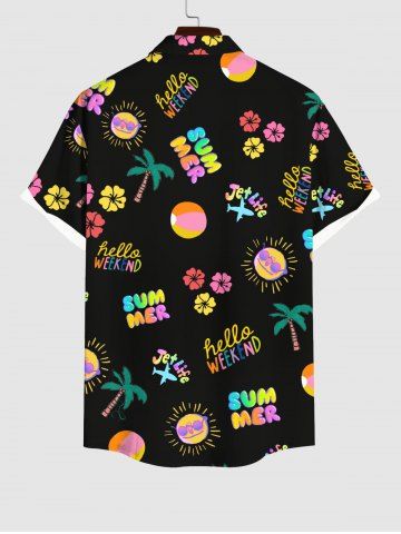 Plus Size Colorful Coconut Tree Sun Letters Floral Print Hawaii Button Pocket Shirt For Men - Black - S