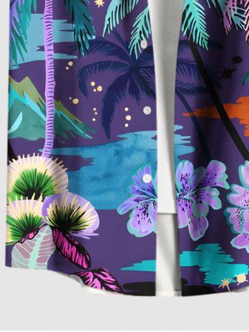 Plus Size Colorful Coconut Tree Tropical Leaf Hibiscus Flower Print Hawaii Button Pocket Shirt For Men - Purple - M