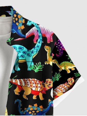 Plus Size Colorful Dinosaur Leaf Print Hawaii Button Pocket Shirt For Men - Black - 4xl