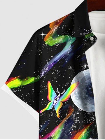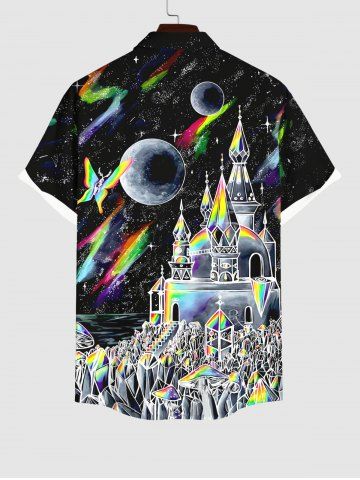 Plus Size Colorful Mushroom Castle Planet Butterfly Print Button Pocket Shirt For Men - Black - 2xl