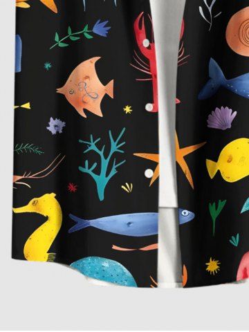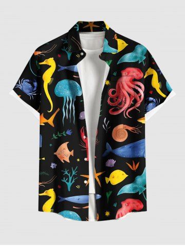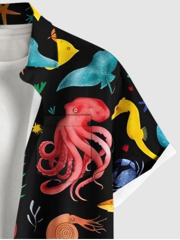 Plus Size Colorful Octopus Jellyfish Seahorse Coral Fish Print Hawaii Sea Creatures Button Pocket Shirt For Men - Black - S